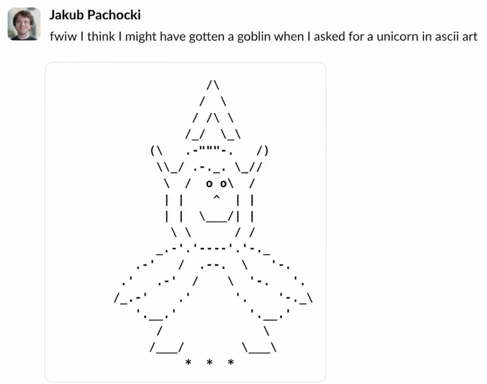 Even OpenAI Chief Scientist Jakub Pachocki got a goblin when he asked for a unicorn in ASCII art.