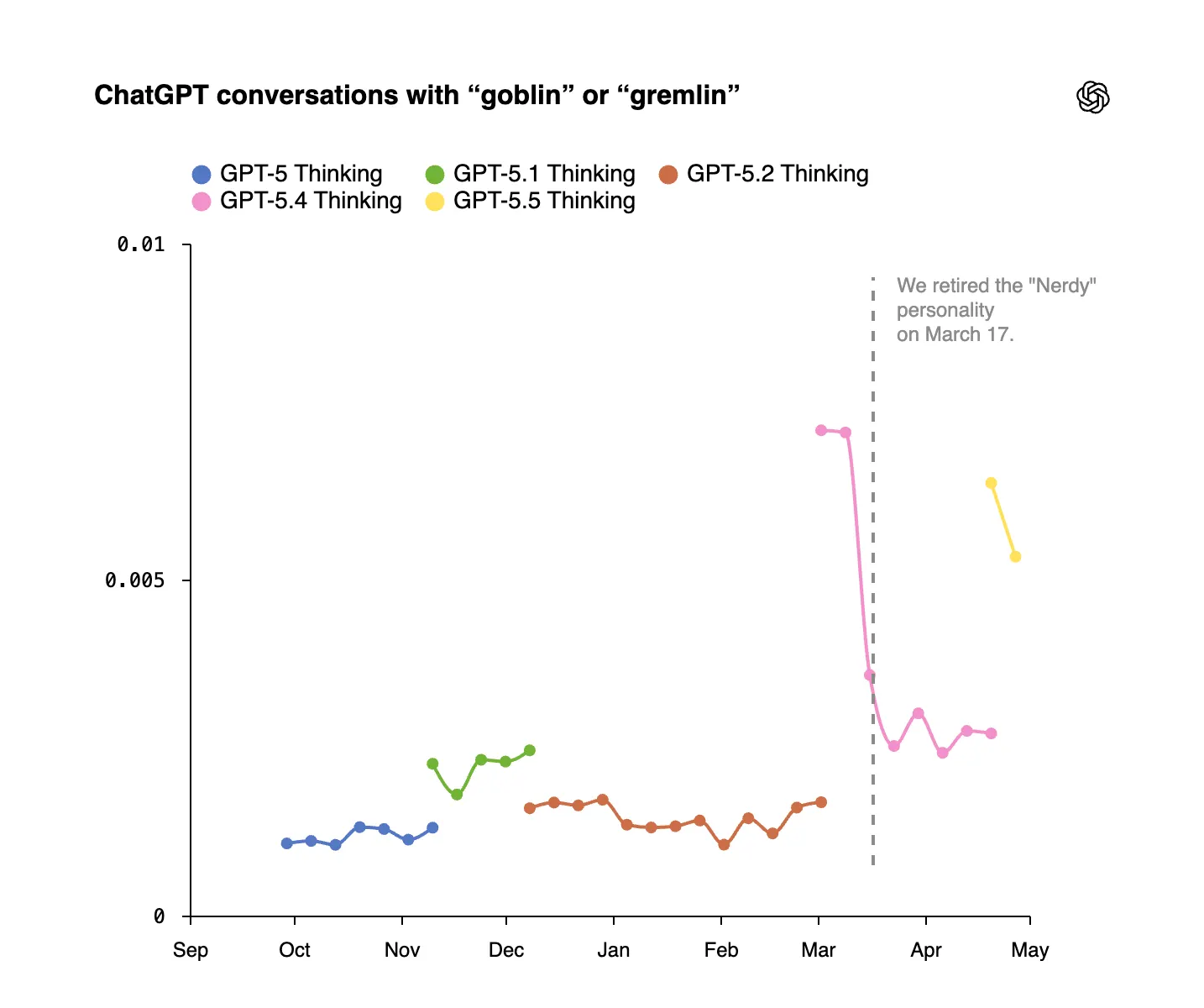 The first measurable spike: goblin mentions rose 175% and gremlin mentions 52% after GPT-5.1’s launch.