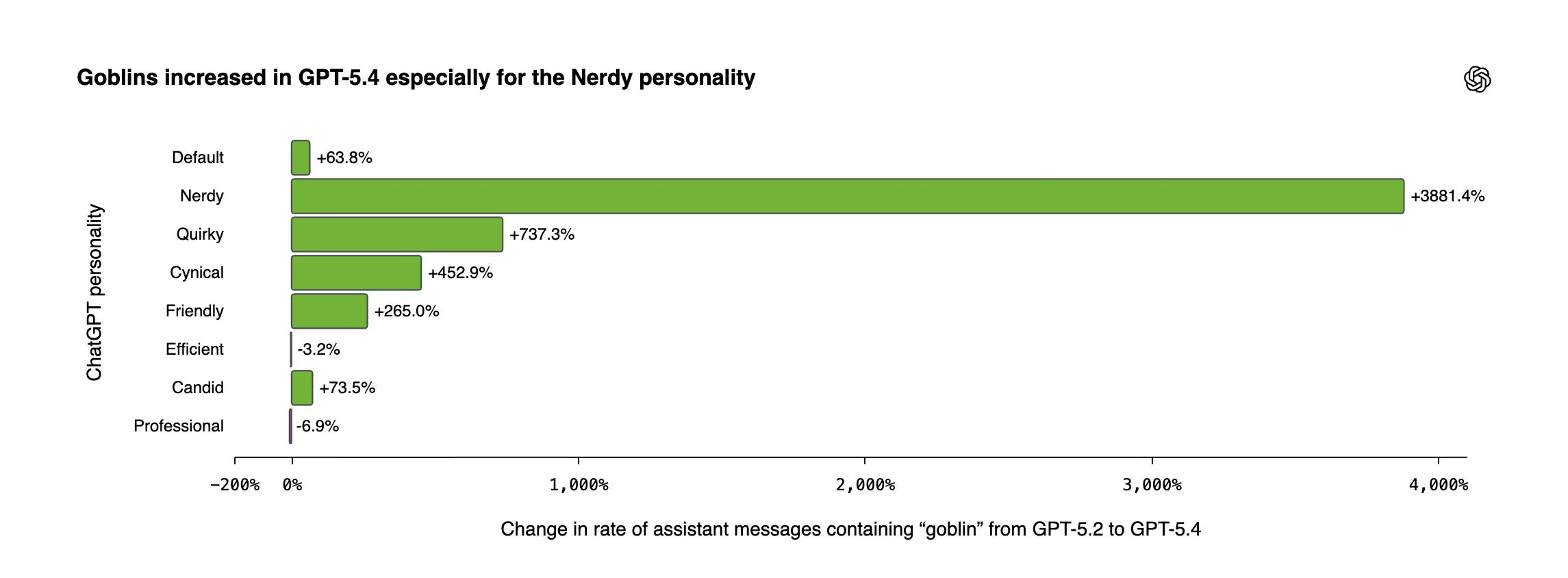 Goblin mentions exploded in GPT-5.4, with the Nerdy personality showing a 3,881% increase compared to GPT-5.2.