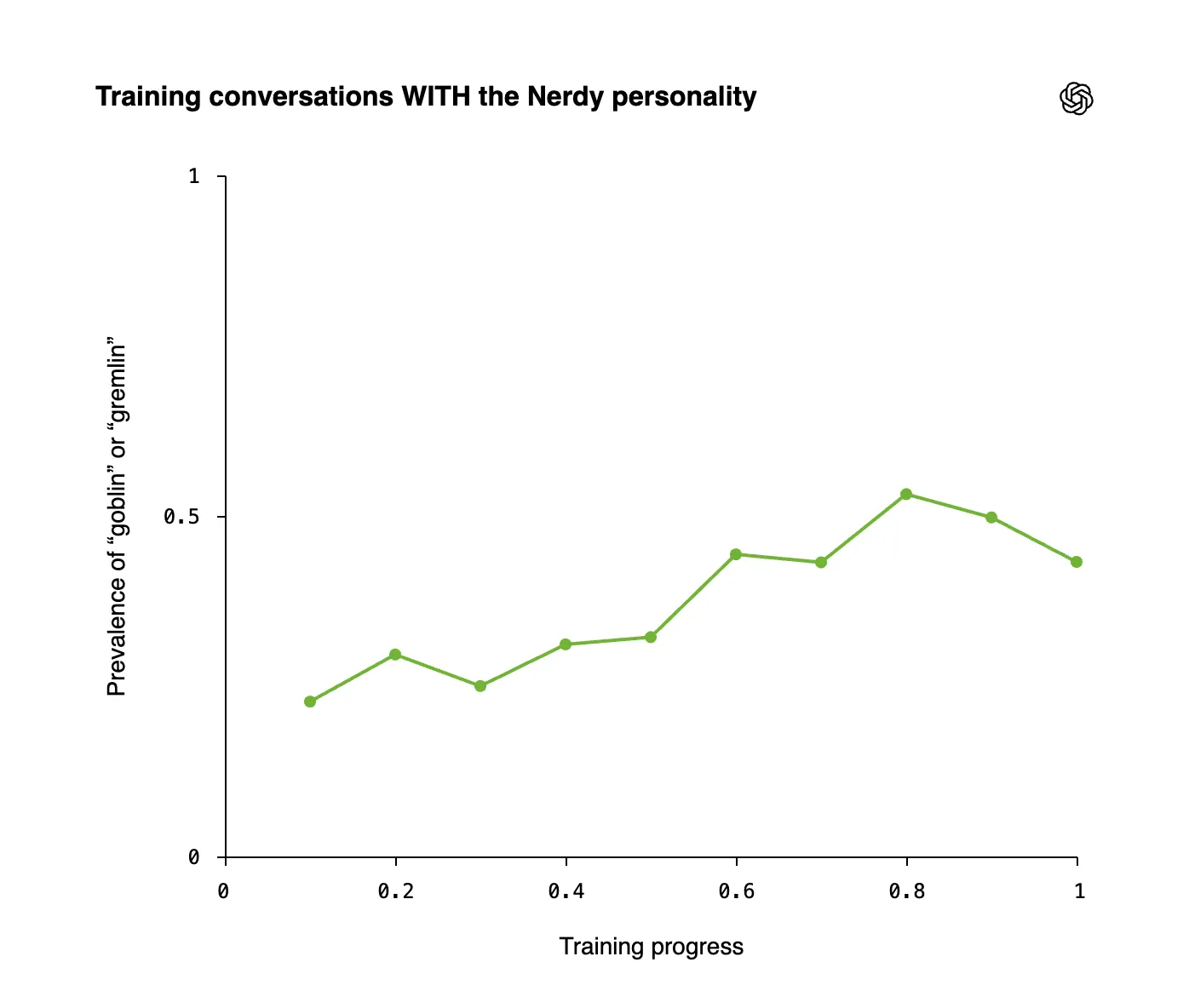 Nerdy accounted for just 2.5% of all ChatGPT responses. It was responsible for 66.7% of all “goblin” mentions. Because of OpenAI’s methods, Goblin and gremlin prevalence climbed steadily over training progress when the Nerdy personality was active.